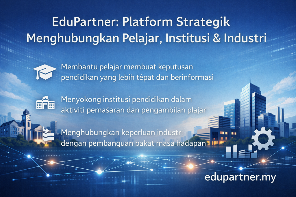 Dalam landskap pendidikan tinggi yang semakin kompetitif dan dinamik, keperluan kepada sebuah platform strategik yang mampu menghubungkan pelajar, institusi pendidikan dan industri menjadi semakin kritikal. EduPartner hadir sebagai penyelesaian menyeluruh yang berfungsi sebagai jambatan strategik antara ketiga-tiga ekosistem ini, khususnya bagi pelajar lepasan SPM yang sedang merancang hala tuju pendidikan dan kerjaya mereka.